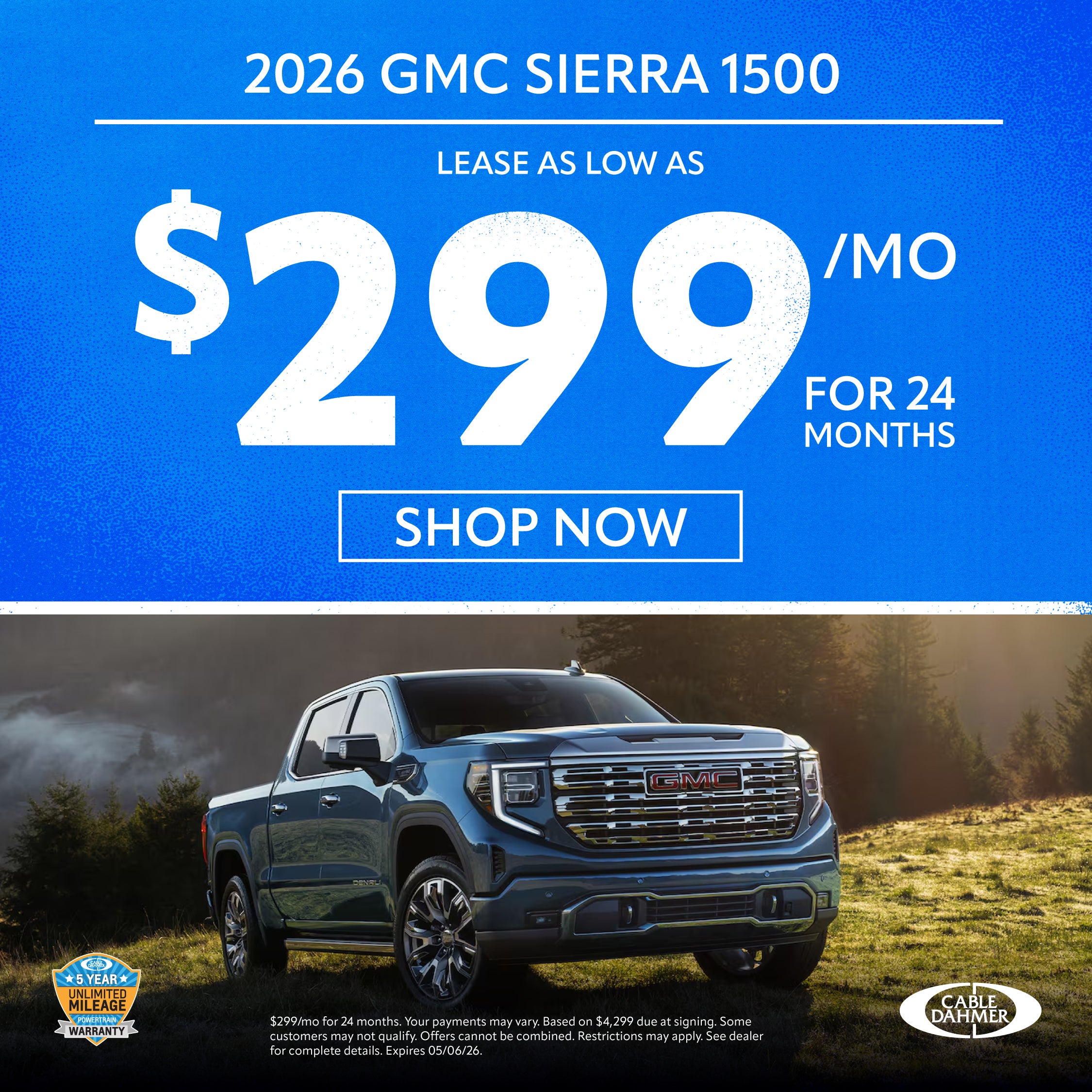 Disclaimer: $299/mo for 24 months. Your payments may vary. Based on $4,299 due at signing. Some customers may not qualify. Offers cannot be combined. Restrictions may apply. See dealer for complete details. Expires 05/06/26.