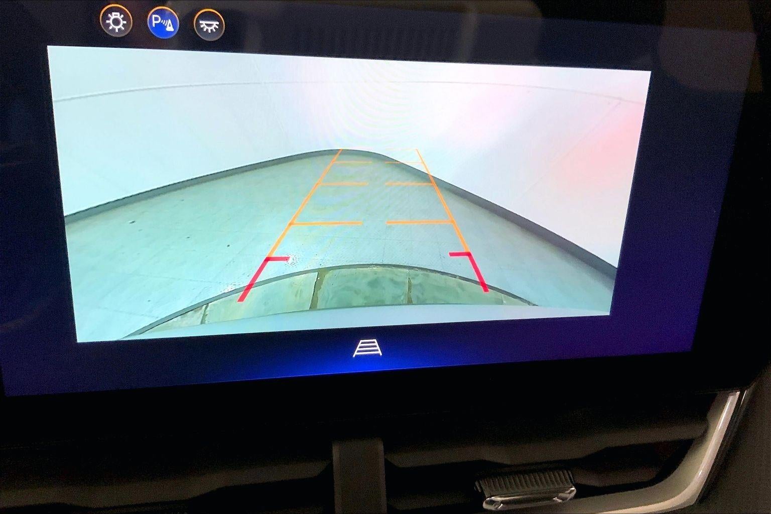 - The vehicle is equipped with a camera that displays an image of the area behind the vehicle on an interior display.
